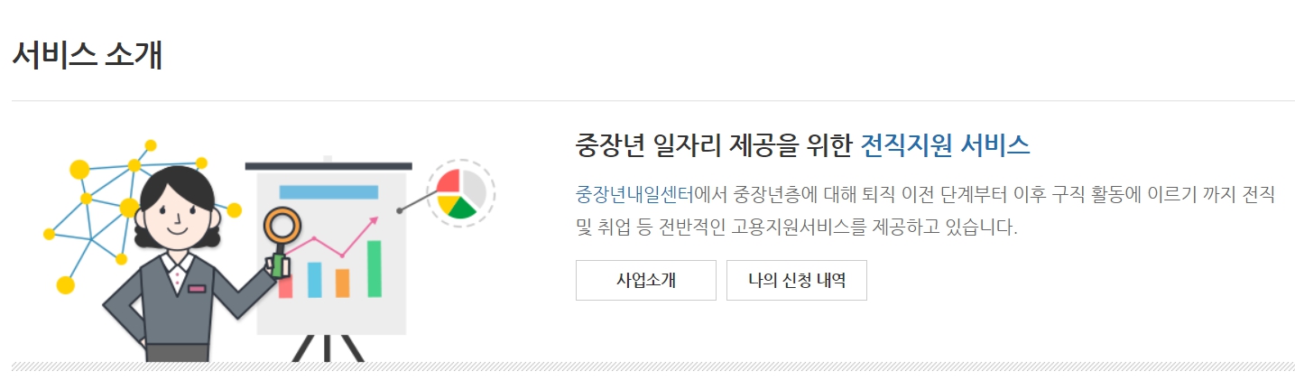 - 주요 서비스: 구직·구인 정보 제공 직업 및 진로 정보 제공 중장년 맞춤형 채용정보 제공