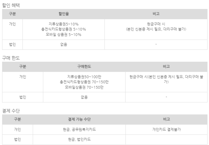 - 개인 구매 한도: 할인 구매 시 1인당 월 50만원 한도가 있습니다.