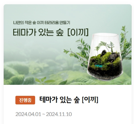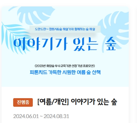 운영 기간: 2024년 7월 11일 ~ 2024년 9월 1일 여름 시즌에 특화된 프로그램으로, 시원한 숲에서의 휴식을 즐길 수 있습니다.