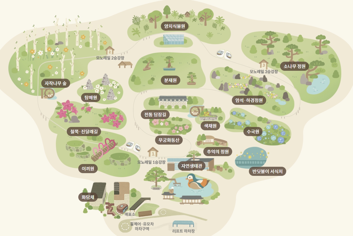 - 관람 코스 16개의 테마원과 4,000여 종의 식물을 관람할 수 있습니다.