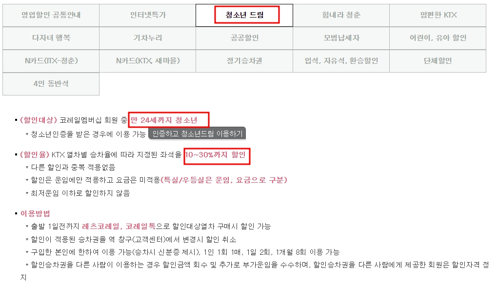 이용 방법: 코레일 멤버십 회원 가입 후, 청소년 인증을 완료해야 합니다.